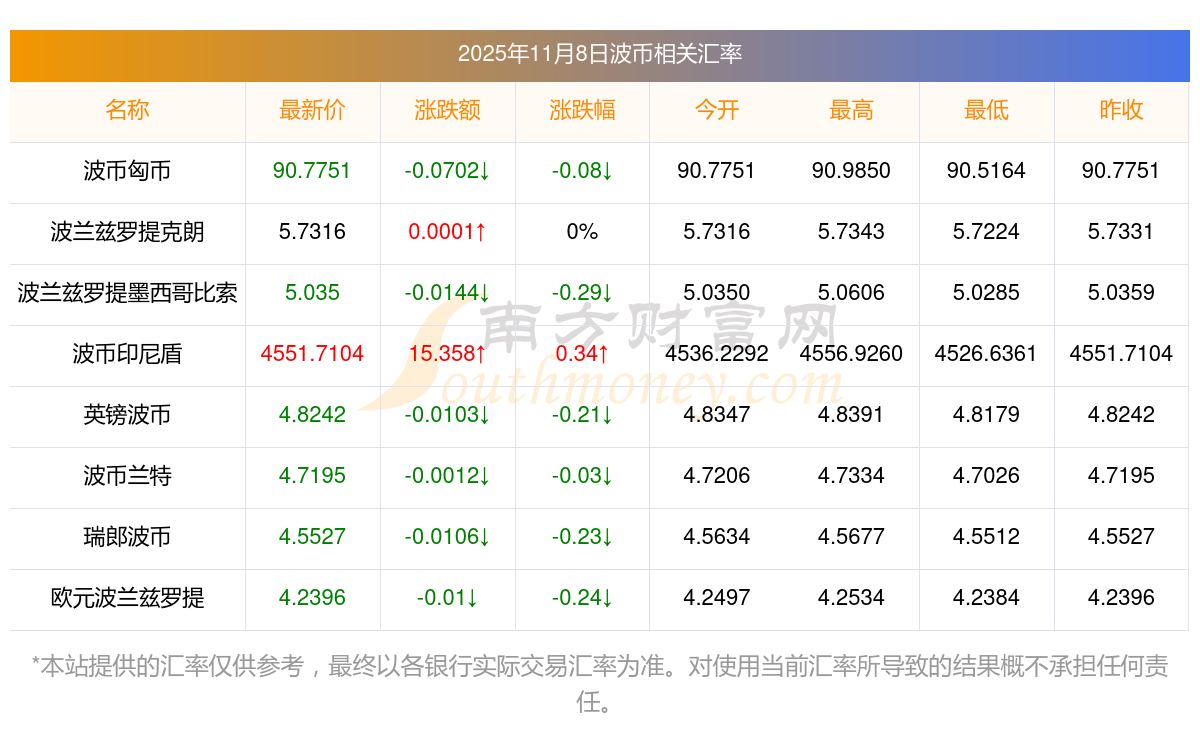 根據(jù)2025年11月8日匯率計(jì)算,波幣兌換蘭特匯率最新價(jià)4.719500,今開價(jià)4.7206,昨收價(jià)4.7195,最高價(jià)4.7334,最低價(jià)4.7026。