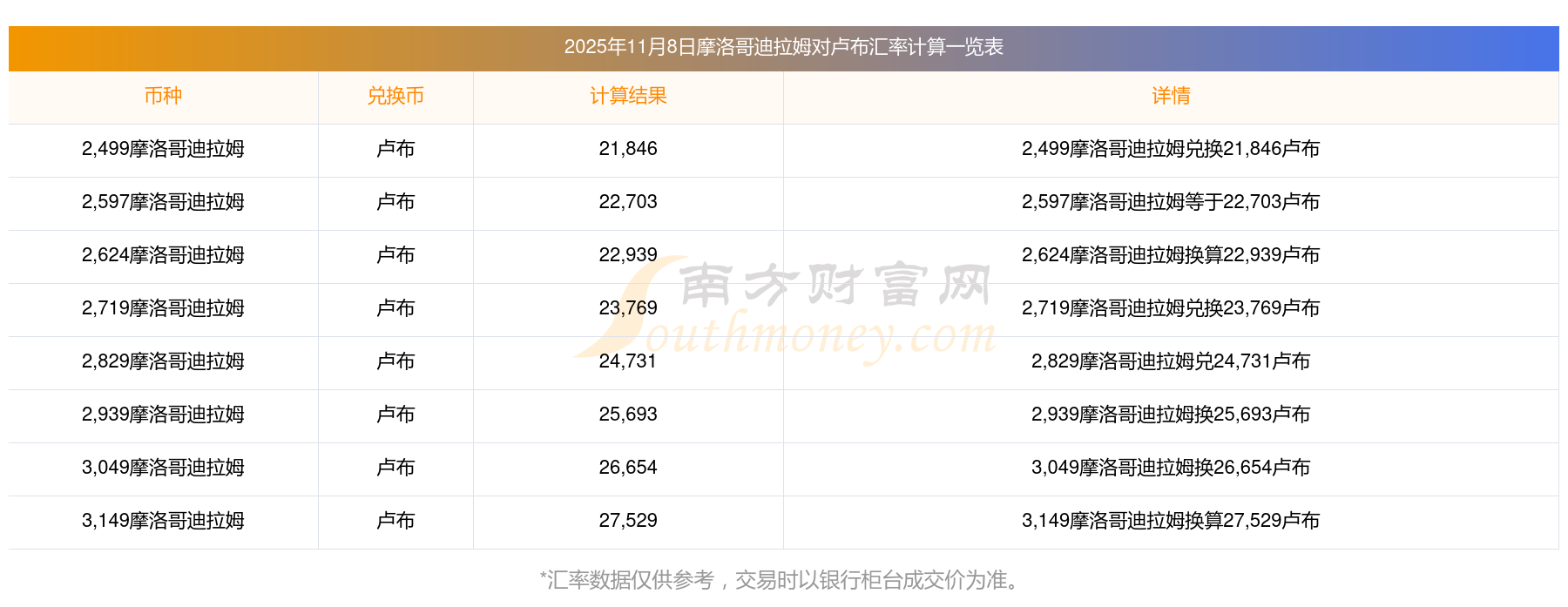 今天匯率更新!2025年11月8日44摩洛哥迪拉姆兌換盧布是多少?
