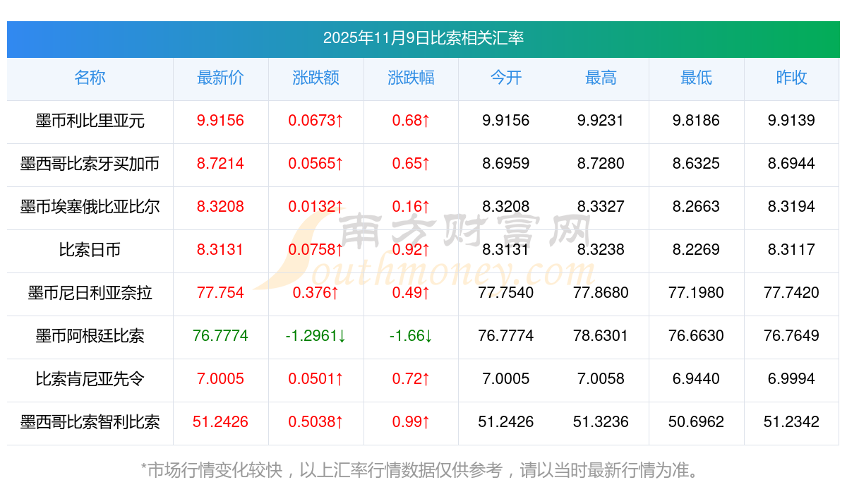 根據(jù)2025年11月9日匯率計(jì)算,MXN兌換BRL匯率最新價(jià)0.288920,今開價(jià)0.2889,昨收價(jià)0.2889,最高價(jià)0.2893,最低價(jià)0.2877。