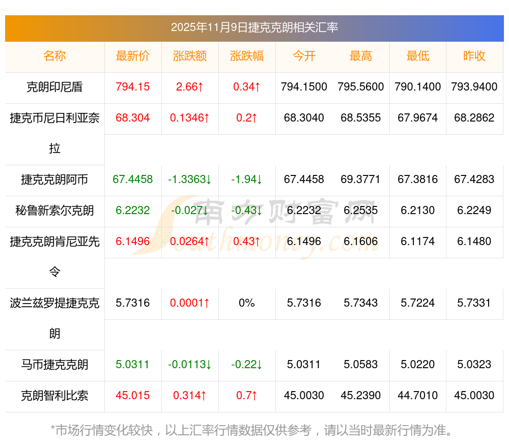 2025年11月9日捷克克朗相關匯率查詢