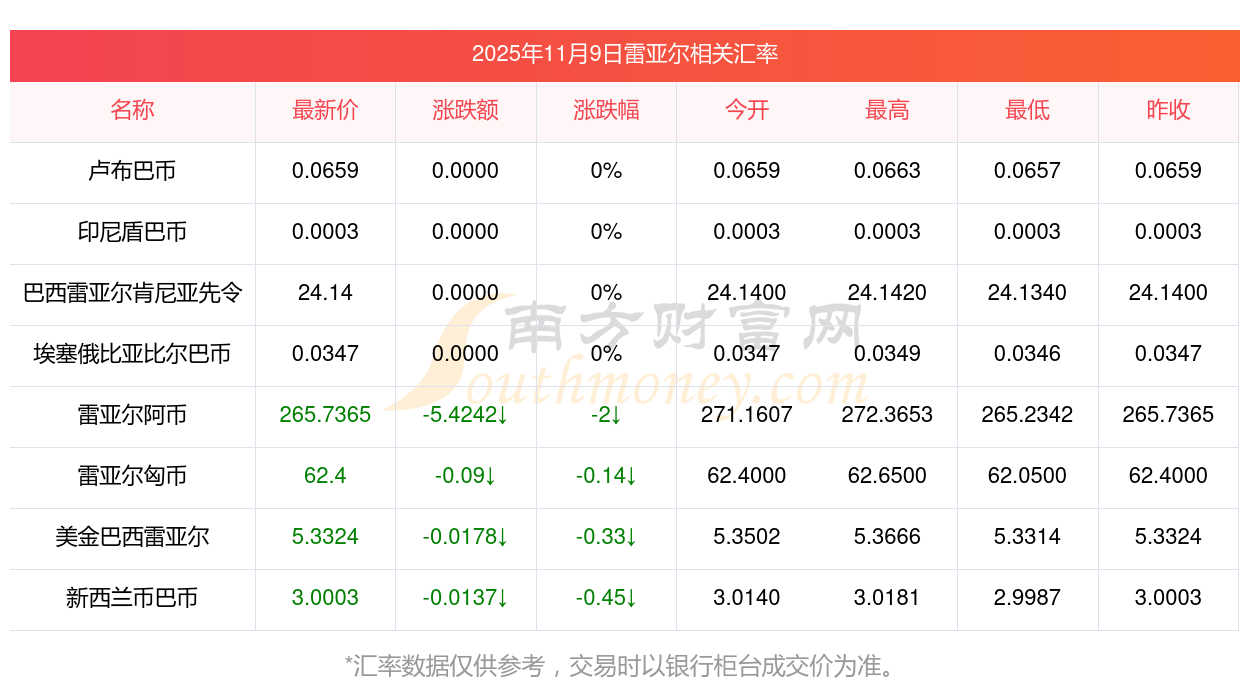 2025年11月9日雷亞爾相關(guān)匯率查詢