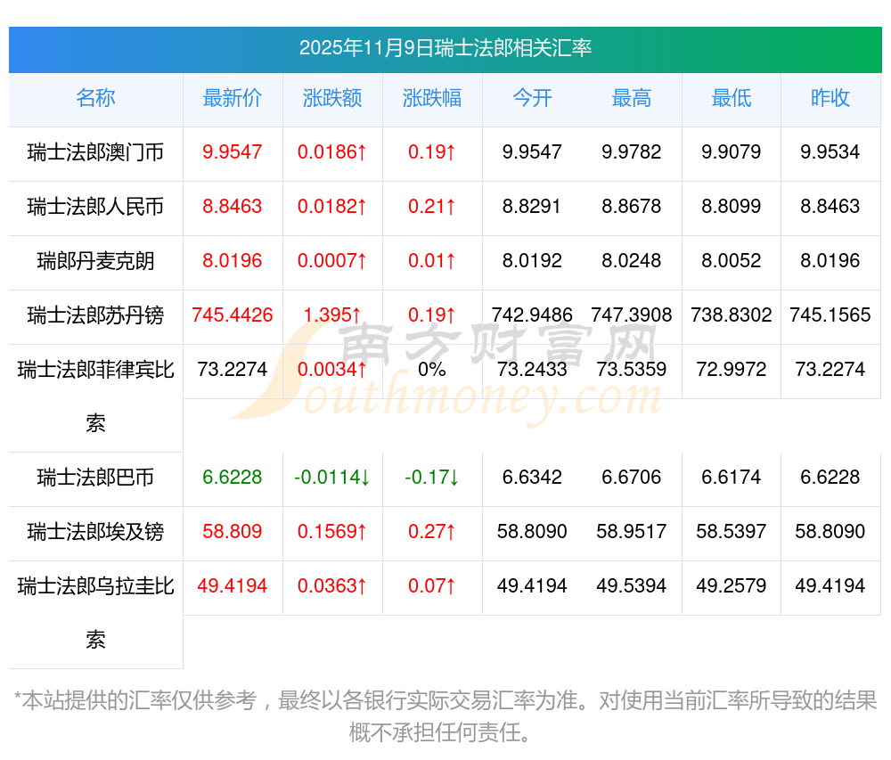 2025年11月9日瑞士法郎相關(guān)匯率查詢