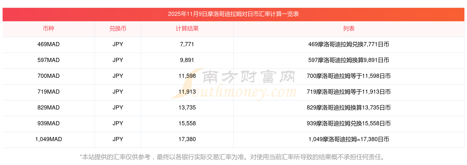 今日迪拉姆匯率 2摩洛哥迪拉姆等于多少日元?11月9日