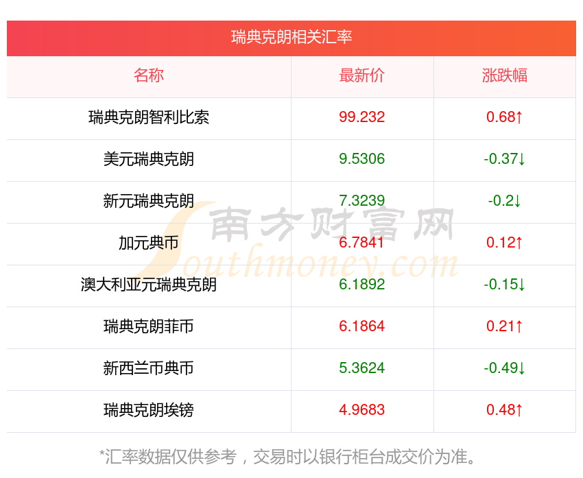 南方財富網為您提供瑞典克朗對挪朗匯率最新價格詳情。