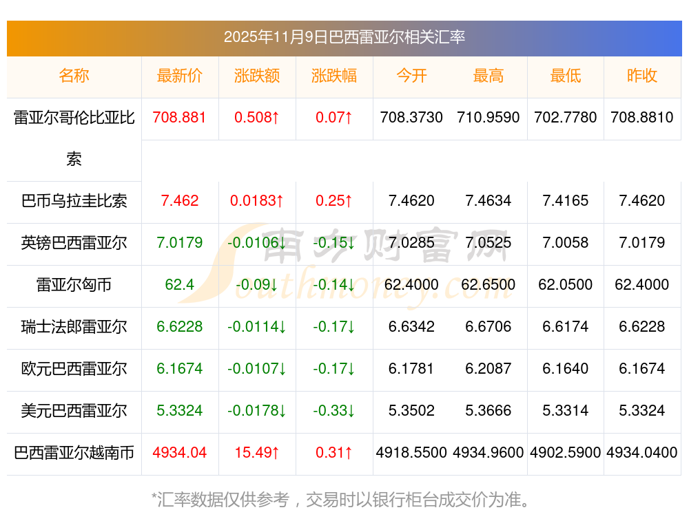2025年11月9日巴西雷亞爾相關匯率查詢