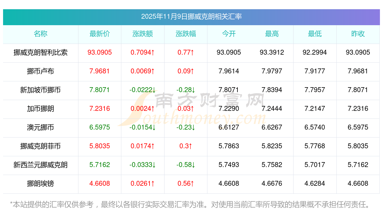 2025年11月9日挪威克朗相關(guān)匯率查詢
