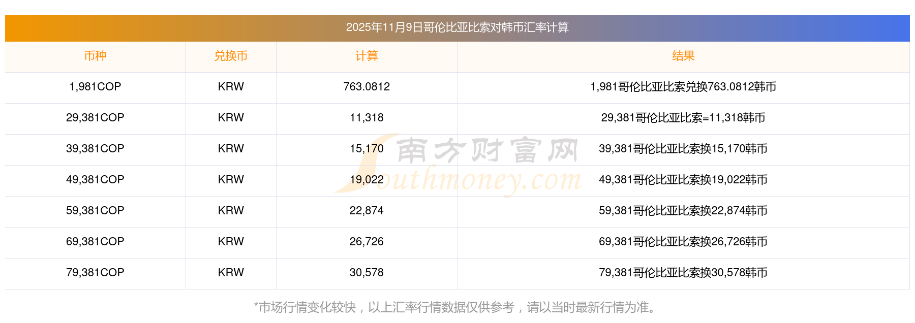今日匯率如何計算:1050哥倫比亞比索對韓幣匯率多少?11月9日