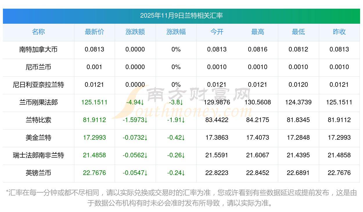 根據(jù)2025年11月9日匯率,蘭特兌換摩洛哥迪拉姆匯率最新價0.535300,今開價0.5357,昨收價0.5353,最高價0.5365,最低價0.5329。