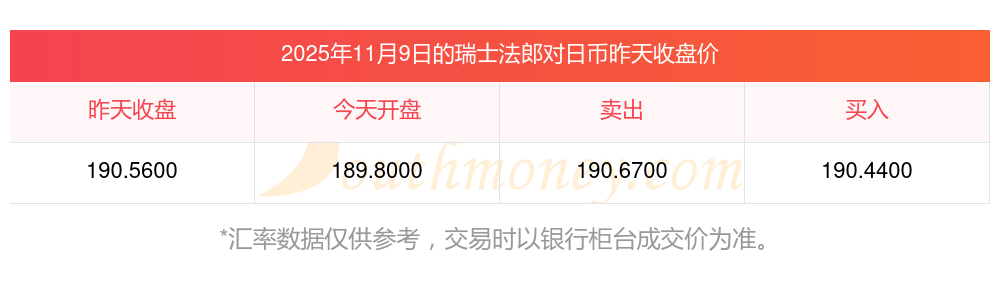 2025年11月9日瑞士法郎兌換日幣匯率是:190.56