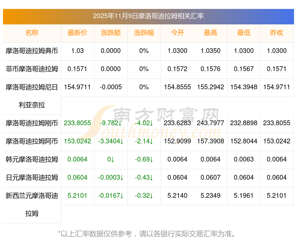 2025年11月9日摩洛哥迪拉姆相關(guān)匯率查詢