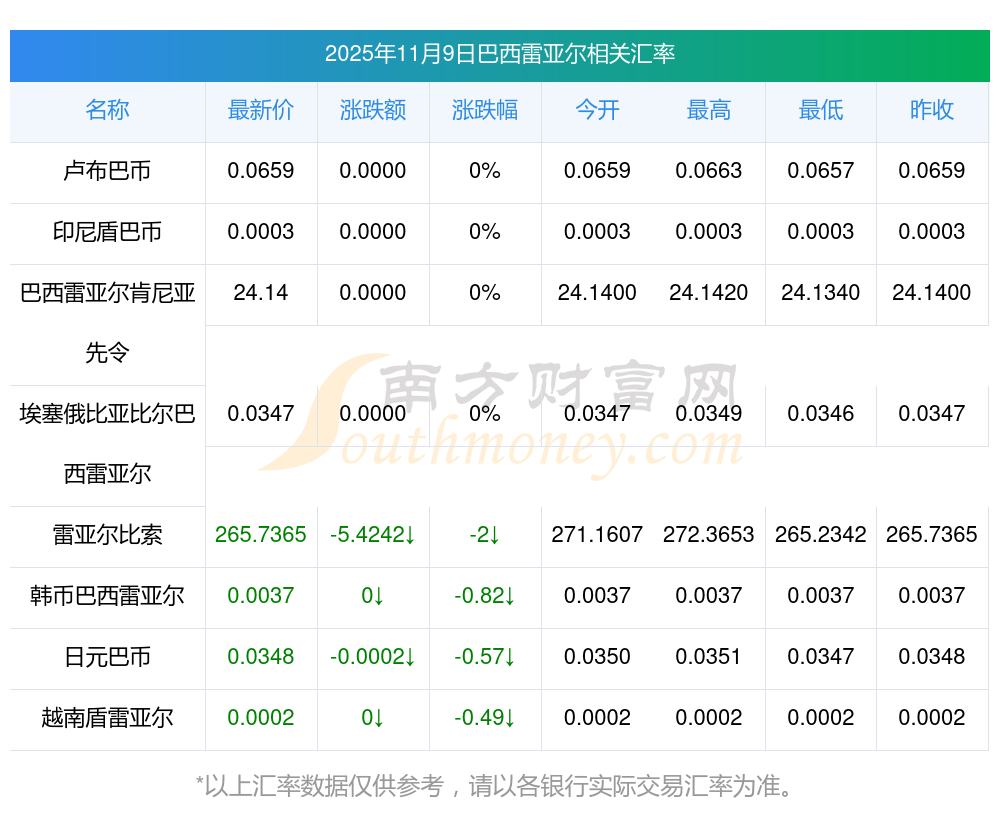 2025年11月9日巴西雷亞爾相關(guān)匯率查詢