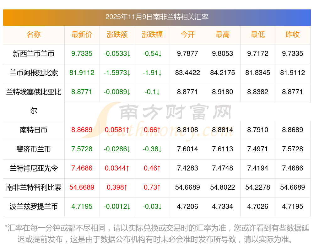 2025年11月9日南非蘭特相關匯率查詢