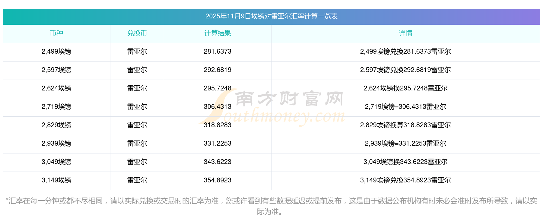 2025年11月9日埃鎊與雷亞爾的兌換匯率計算如下: