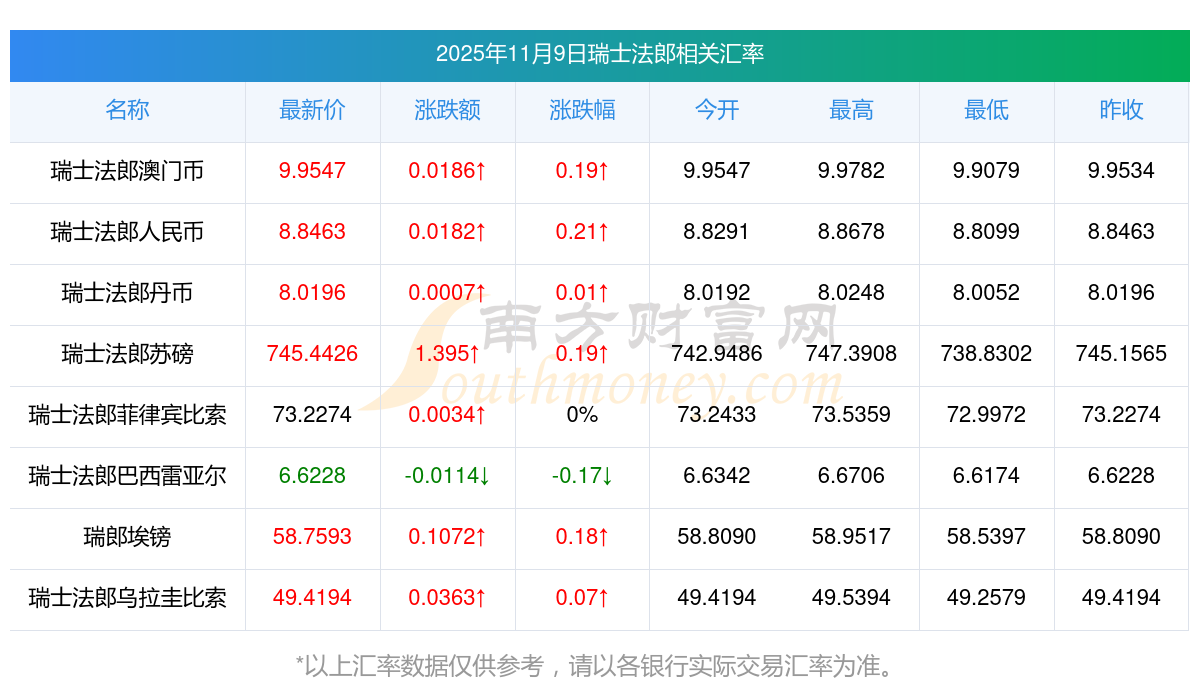 2025年11月9日瑞士法郎相關(guān)匯率查詢