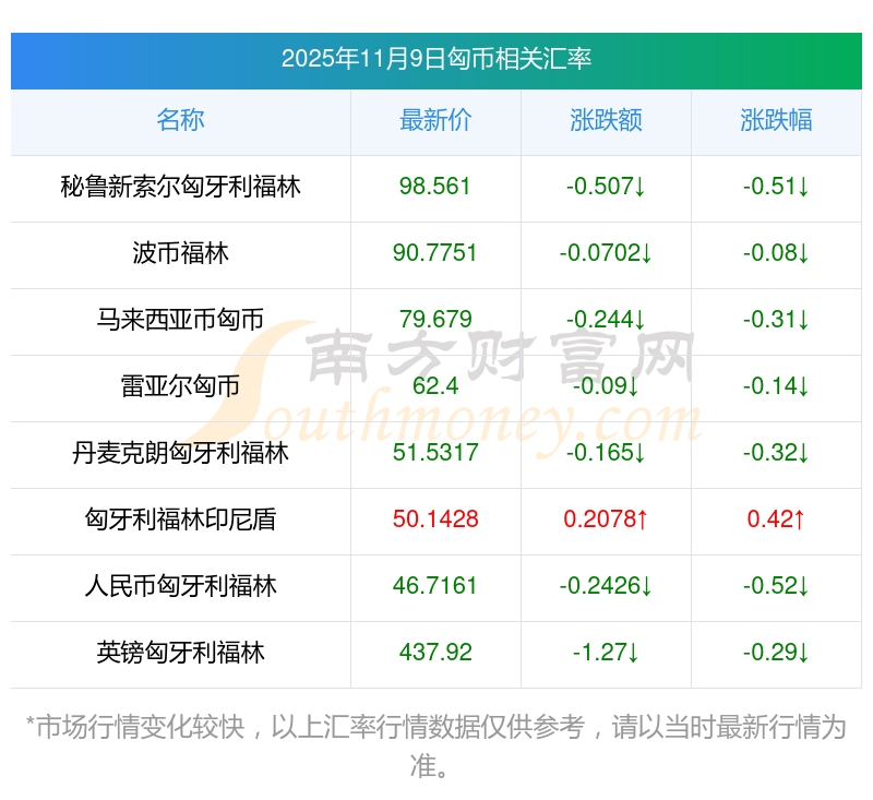 根據(jù)2025年11月9日匯率計(jì)算,HUF兌換COP匯率最新價(jià)11.360300:今日開價(jià)11.3603,昨日收價(jià)11.3603,最高價(jià)11.4179,最低價(jià)11.2952。