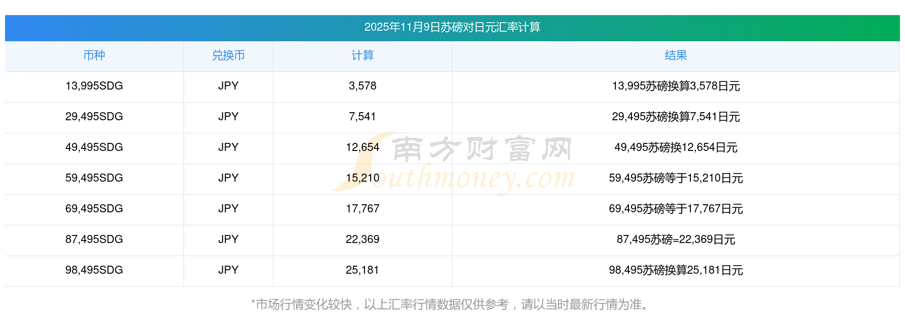 蘇丹鎊匯率行情:今日10蘇丹鎊等于多少日元?2025-11-09