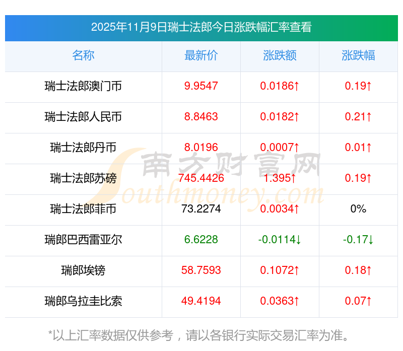 2025年11月9日瑞士法郎相關(guān)匯率查詢(xún)