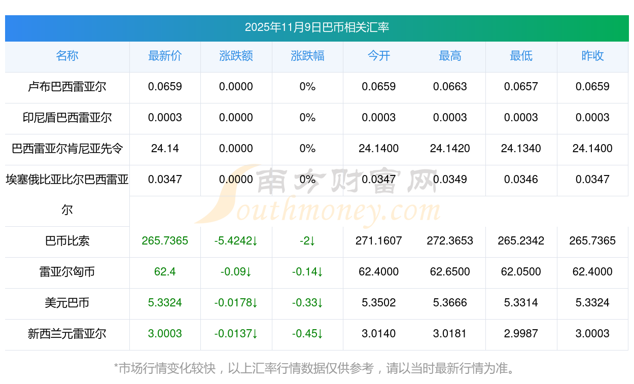 根據(jù)2025年11月9日匯率,巴幣兌換利幣匯率最新34.318900,今開34.3189,昨收34.3189,最高34.3253,最低34.0256。