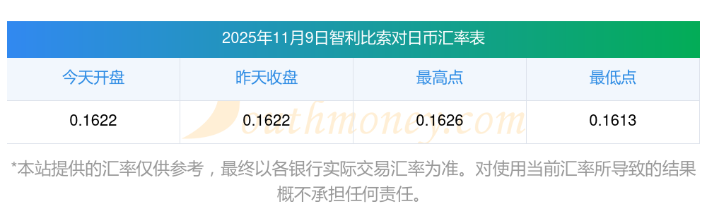2025年11月9日今天匯率,換算智利比索(CLP)到日幣(JPY):1智利比索等于0.1622日幣