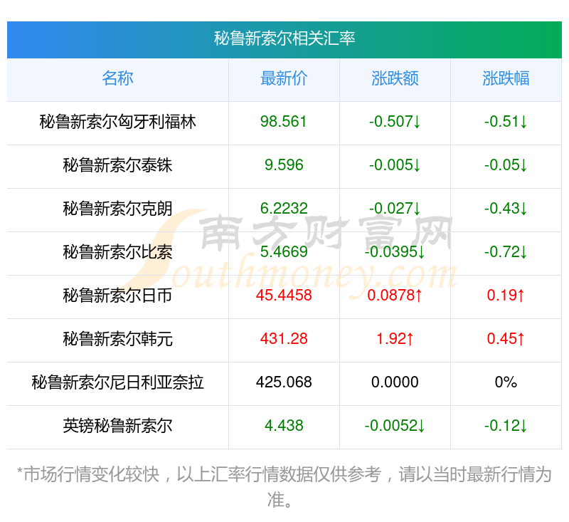 南方財富網(wǎng)為您提供秘魯新索爾對尼日利亞奈拉匯率最新價格詳情。