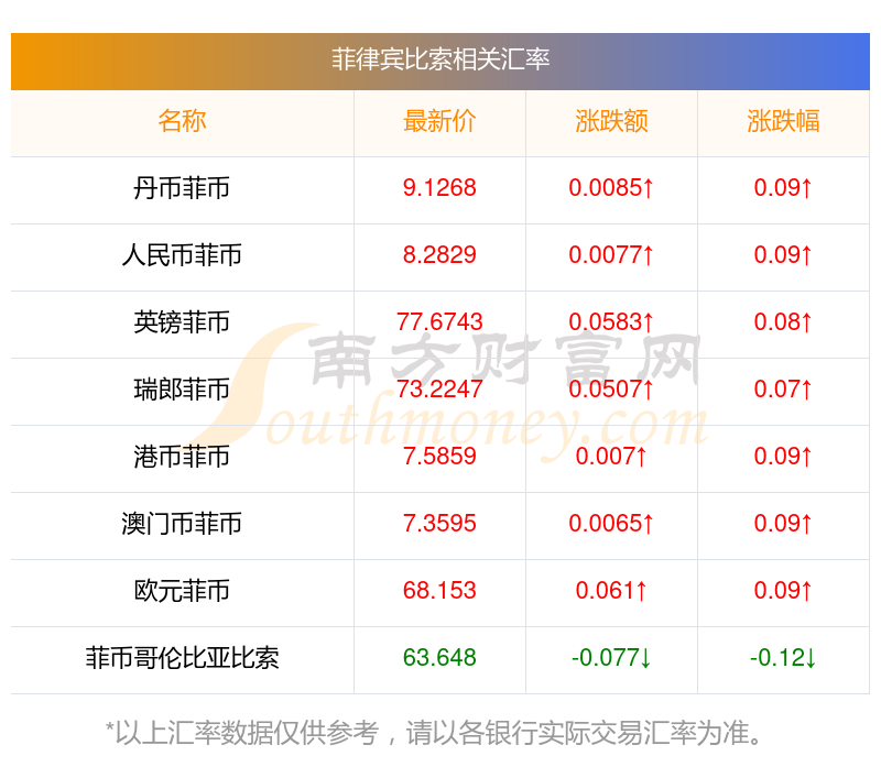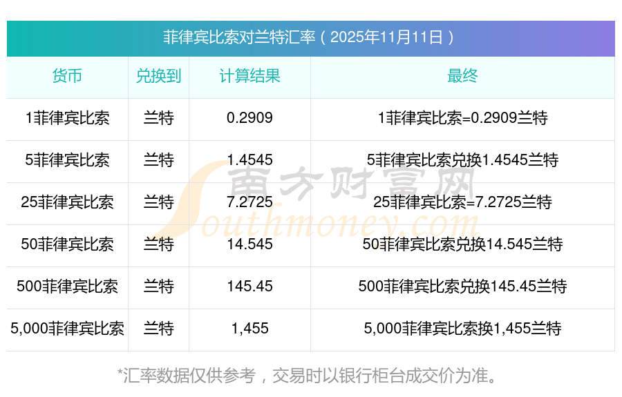 南方財(cái)富網(wǎng)為您提供菲律賓比索對(duì)蘭特匯率最新價(jià)格詳情。