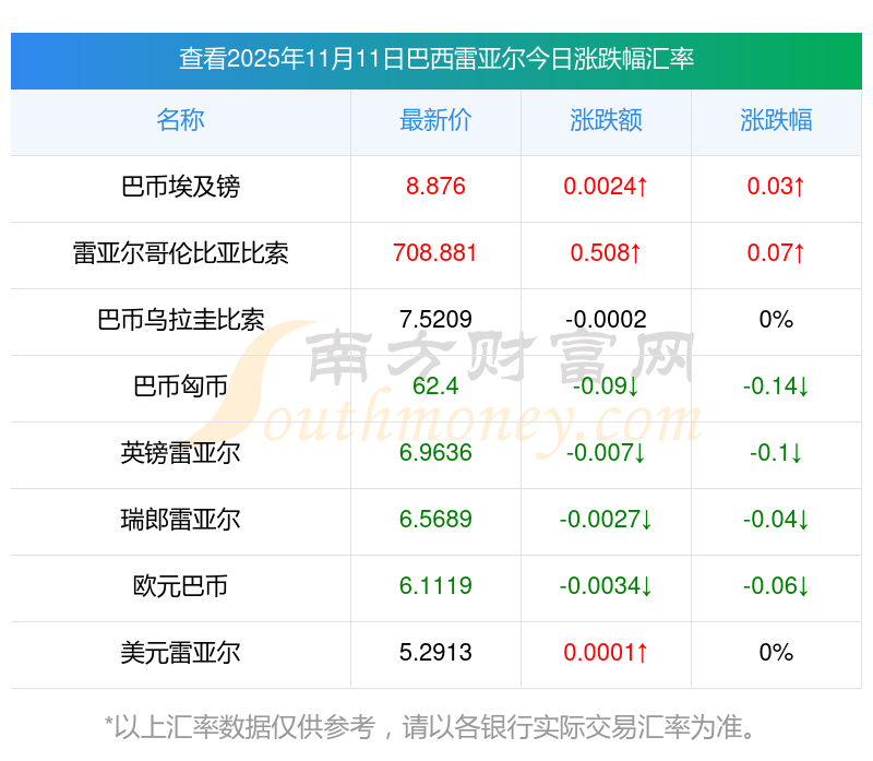 2025年11月11日巴西雷亞爾相關(guān)匯率查詢