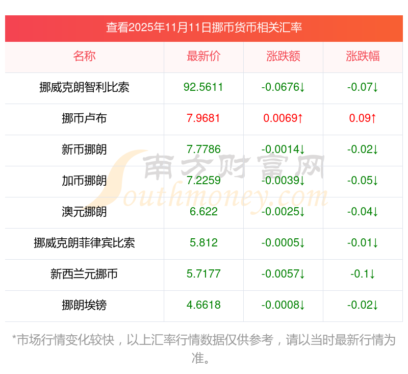 2025年11月11日最新消息,挪幣兌換澳幣最新匯率為0.151100,今開為0.1510,昨收為0.1510,最高為0.1512,最低為0.1498。