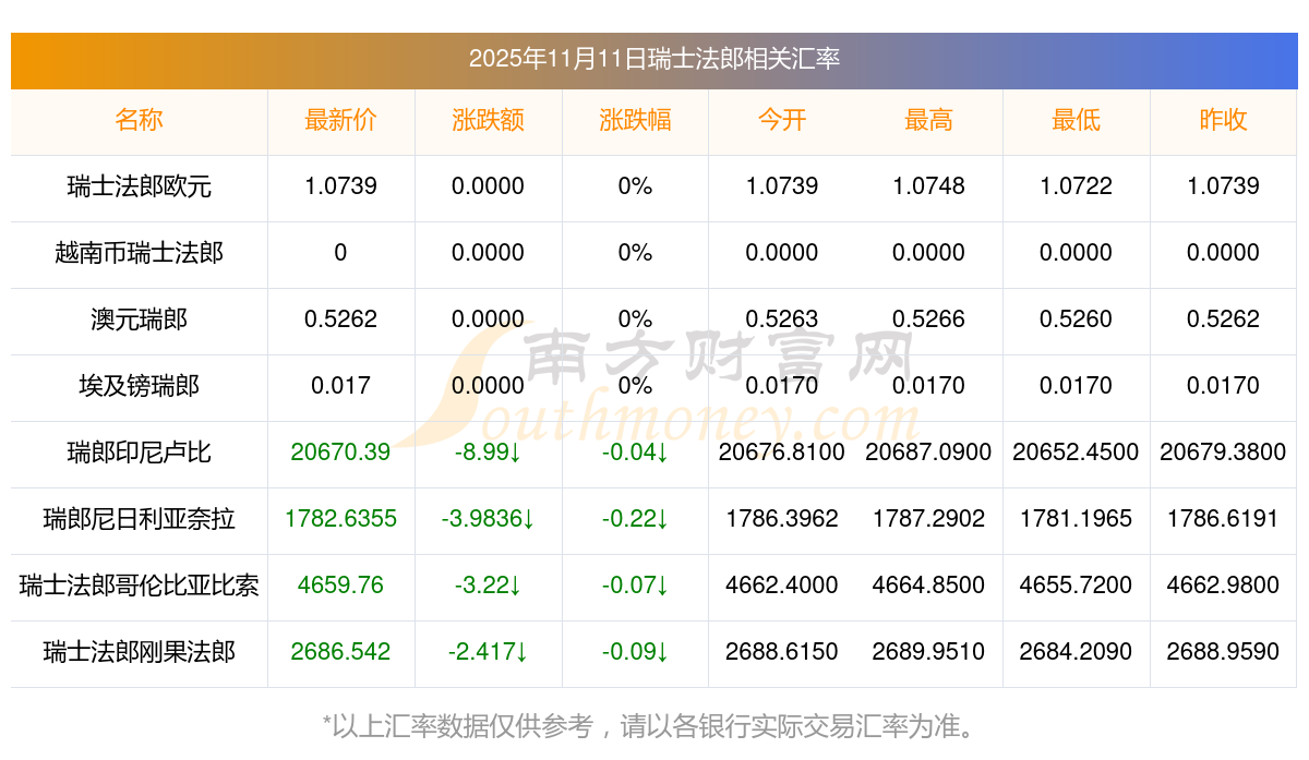 2025年11月11日瑞士法郎相關(guān)匯率查詢