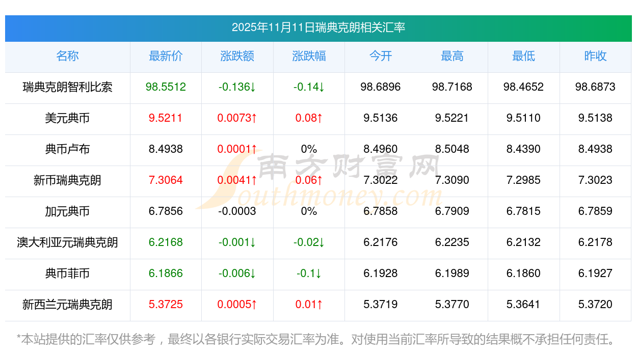2025年11月11日瑞典克朗相關(guān)匯率查詢