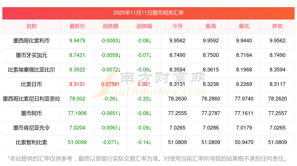 根據(jù)2025年11月11日匯率,墨幣兌換牙買加元匯率最新價(jià)8.743100,今開(kāi)價(jià)8.7490,昨收價(jià)8.7490,最高價(jià)8.7500,最低價(jià)8.7164。