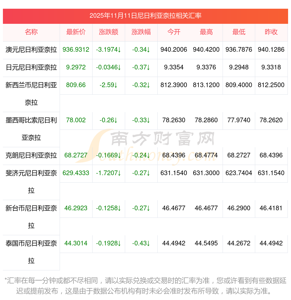 2025年11月11日尼日利亞奈拉相關(guān)匯率查詢