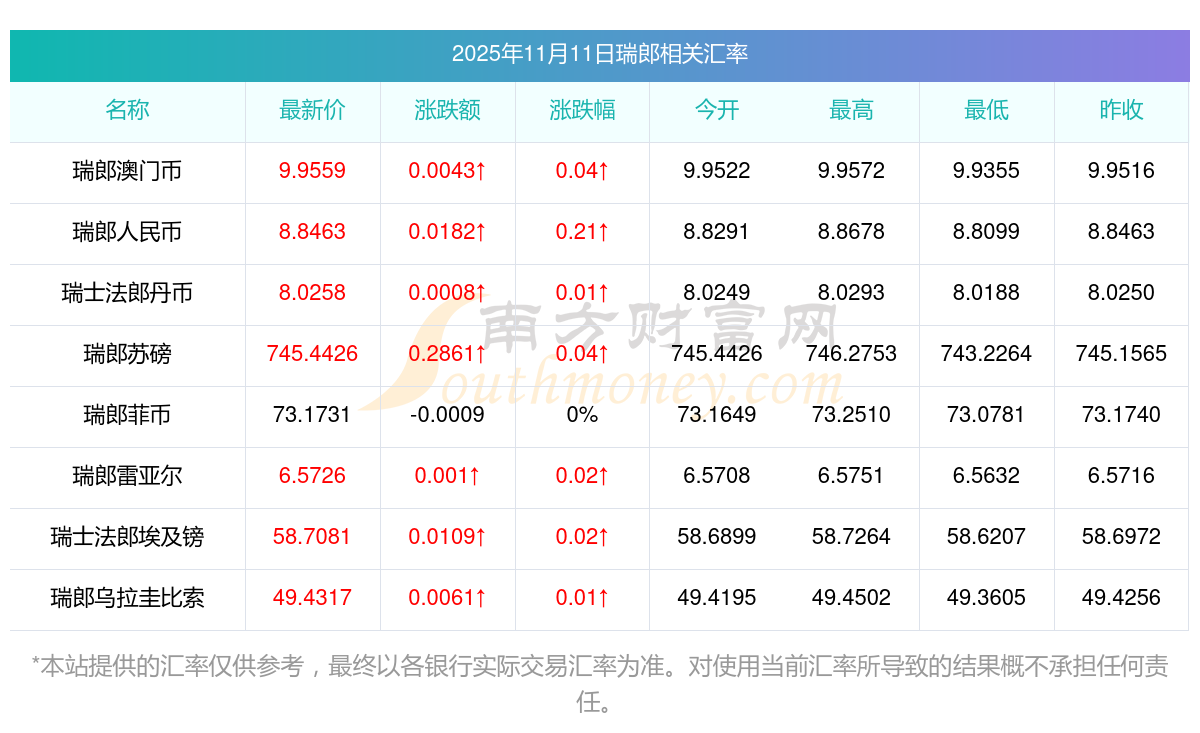 2025年11月11日瑞郎相關(guān)匯率查詢