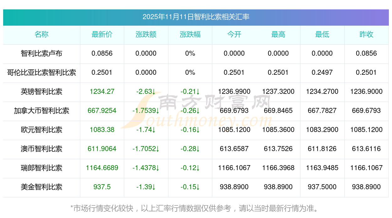 根據(jù)2025年11月11日匯率,智利比索兌換哥倫比亞比索匯率最新價(jià)3.998900,今開價(jià)3.9988,昨收價(jià)3.9988,最高價(jià)4.0048,最低價(jià)3.9988。