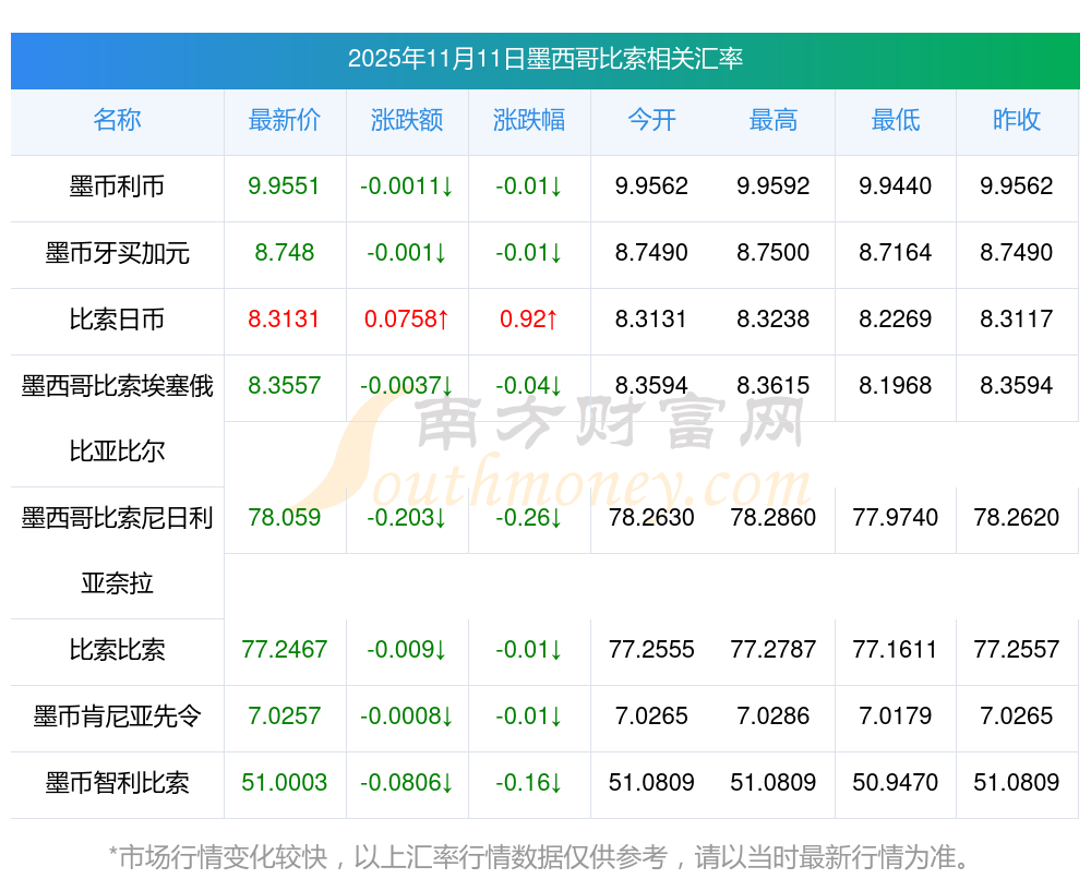 2025年11月11日墨西哥比索相關(guān)匯率查詢
