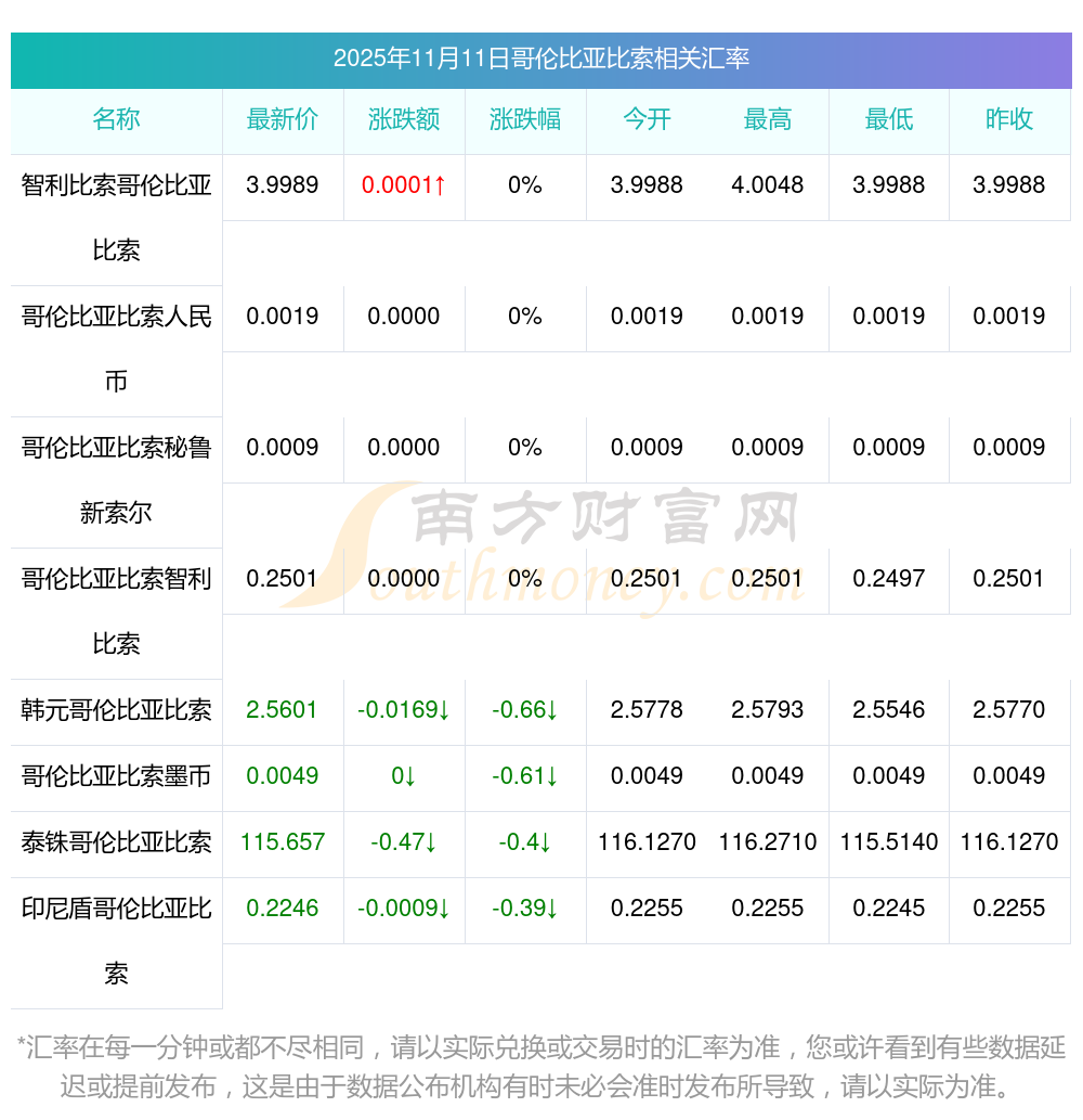 2025年11月11日哥倫比亞比索相關(guān)匯率查詢