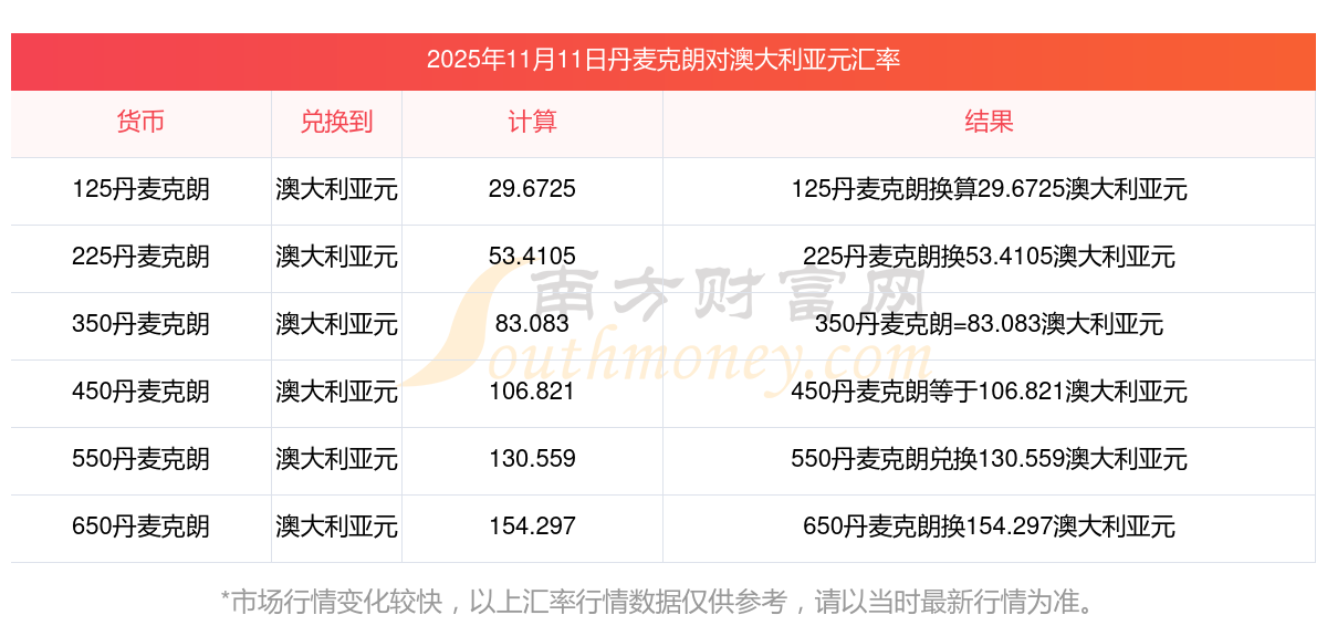 2025年11月11日丹麥克朗與澳大利亞元的兌換匯率計算如下: