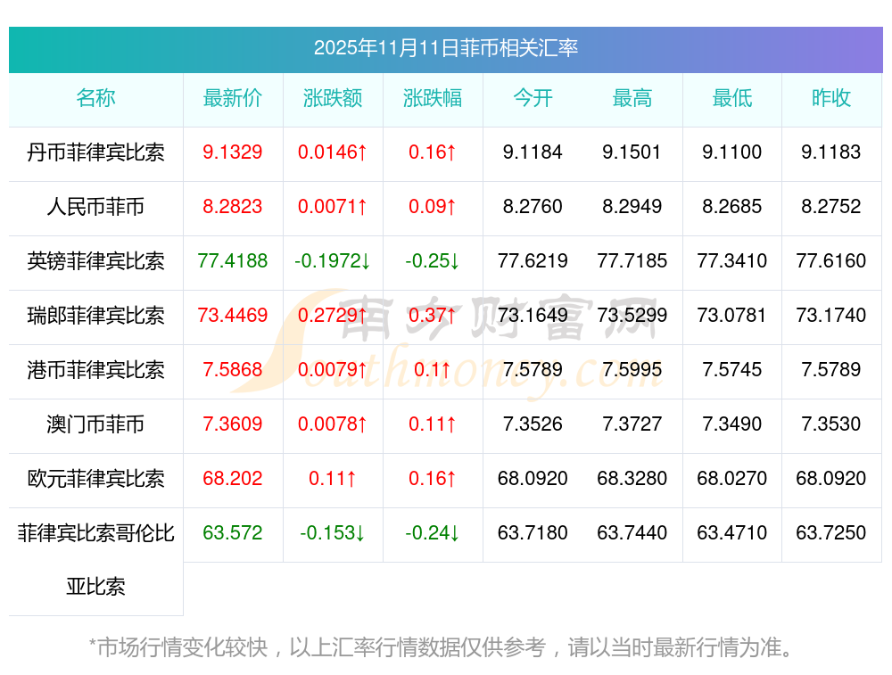 根據2025年11月11日匯率,菲幣兌換瑞郎匯率最新0.013612,今開0.0137,昨收0.0137,最高0.0137,最低0.0136。