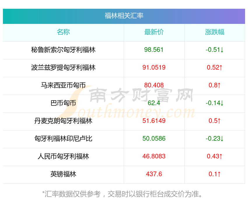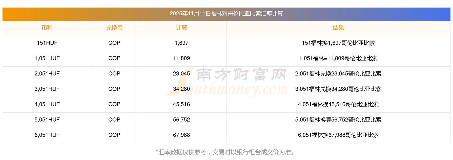 南方財富網為您提供福林對哥倫比亞比索匯率最新價格詳情。