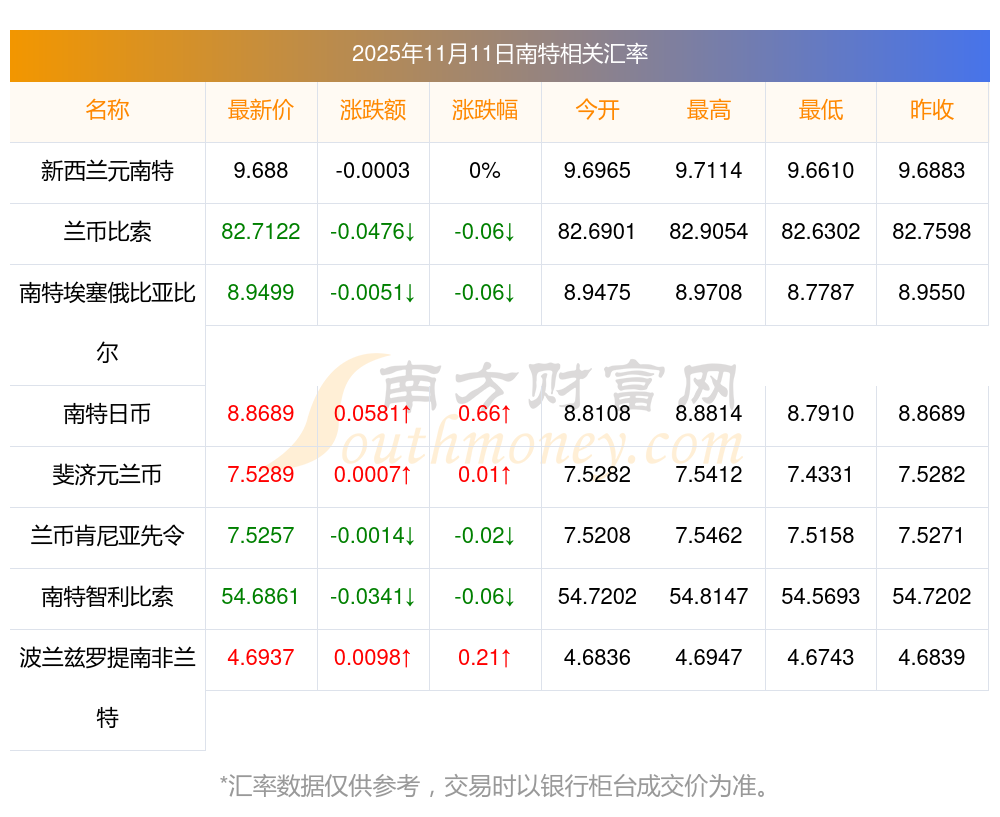 根據(jù)2025年11月11日匯率,南特兌換人民幣匯率最新價0.414800,今開價0.4146,昨收價0.4150,最高價0.4158,最低價0.4143。