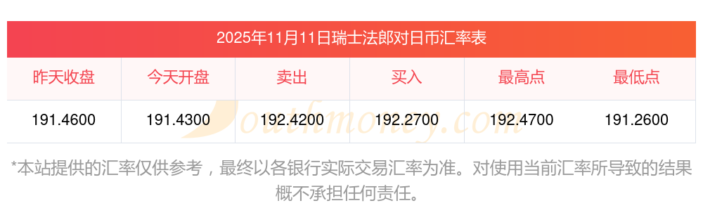 瑞士法郎對日元的匯率是多少?(2025年11月11日)