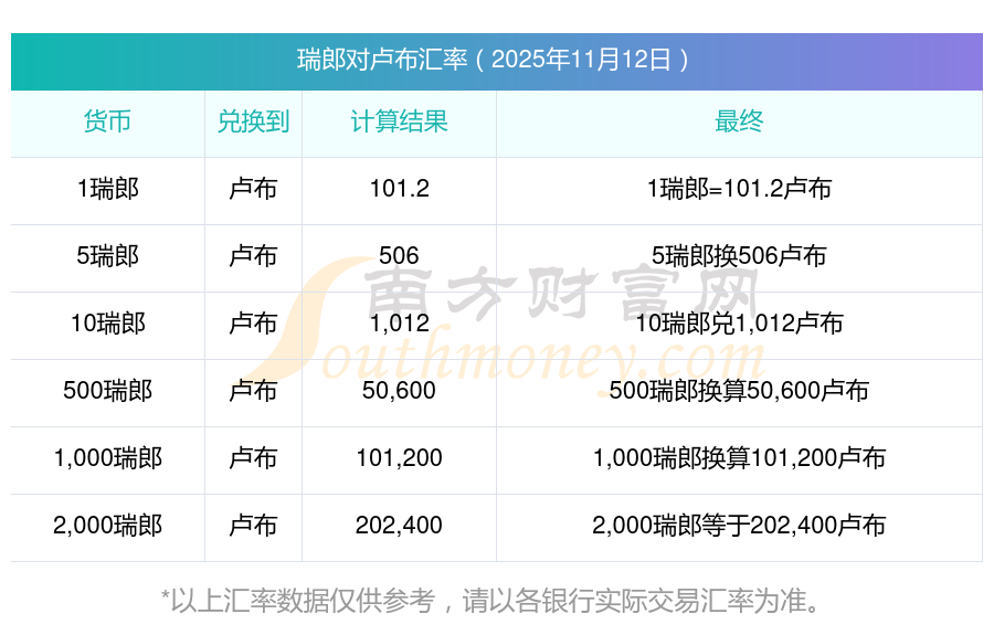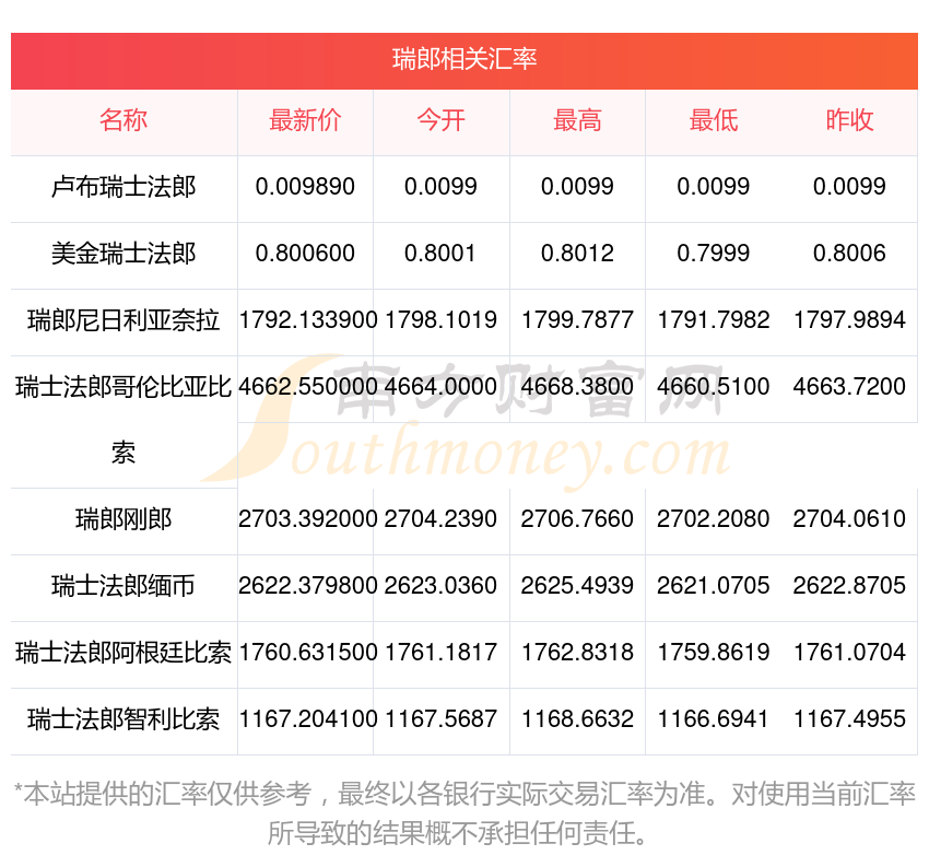 南方財(cái)富網(wǎng)為您提供瑞郎對(duì)盧布匯率最新價(jià)格詳情。