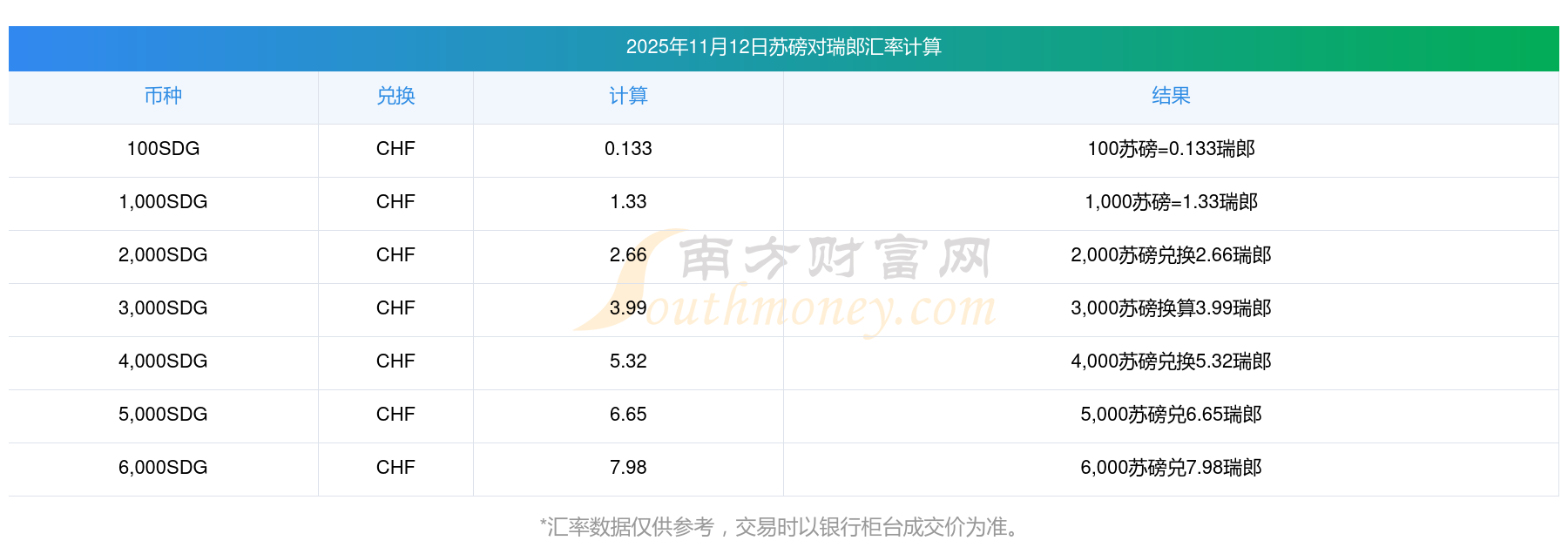 2025年11月12日今天匯率,換算蘇磅(SDG)到瑞郎(CHF):