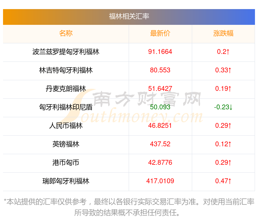 南方財(cái)富網(wǎng)為您提供福林對(duì)埃及鎊匯率最新價(jià)格詳情。