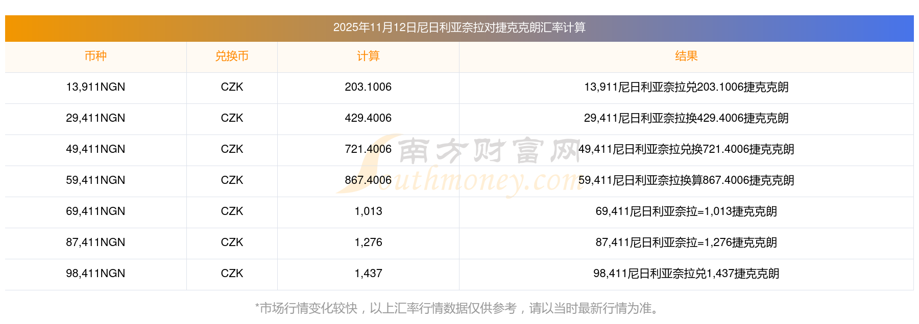 2025年11月12日尼日利亞奈拉兌換捷克克朗匯率是:0.0146