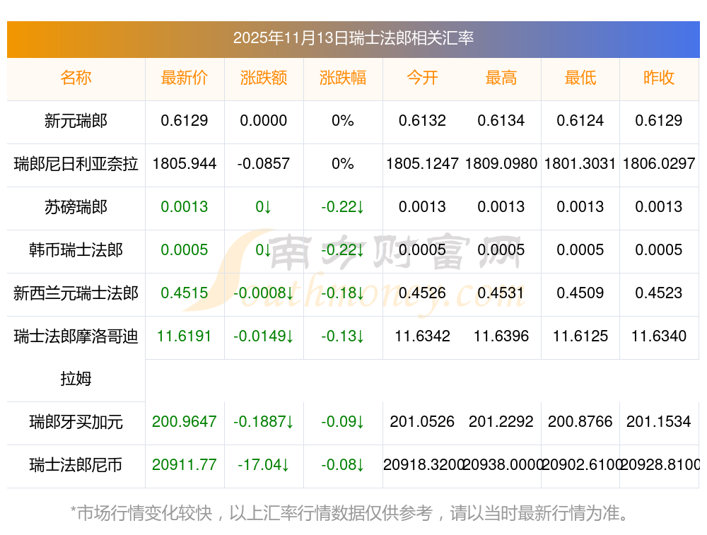 2025年11月13日瑞士法郎相關(guān)匯率查詢