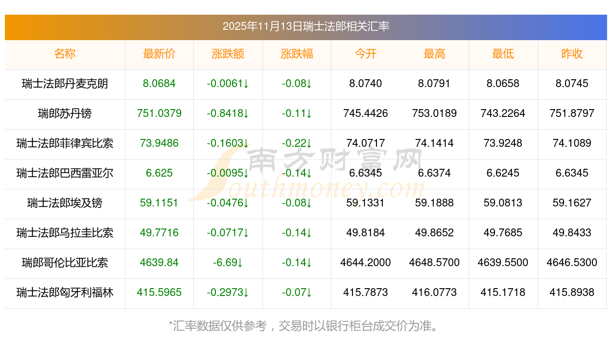 2025年11月13日瑞士法郎相關(guān)匯率查詢