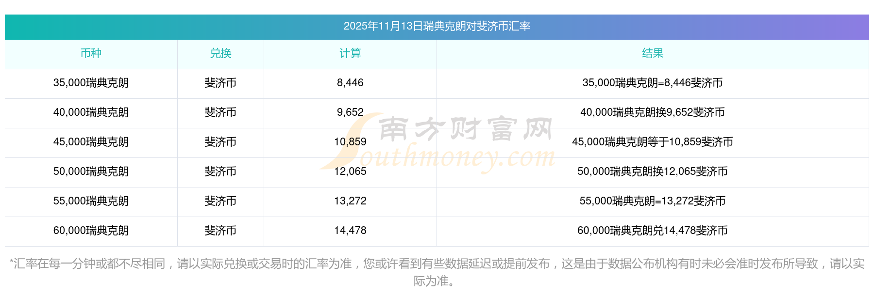 瑞典克朗的匯率,2025/11/13瑞典克朗與斐濟幣的換算?