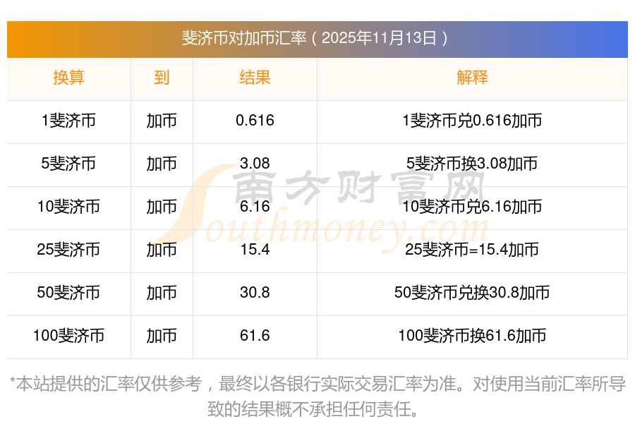 今天匯率更新!2025年11月13日62斐濟(jì)幣兌換加幣是多少?