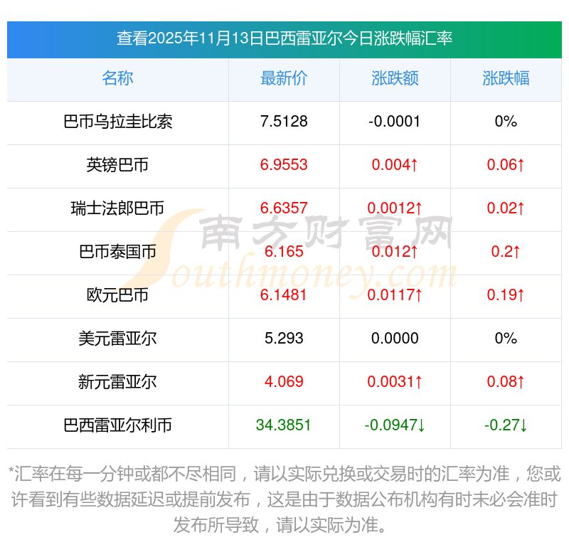 2025年11月13日巴西雷亞爾相關(guān)匯率查詢