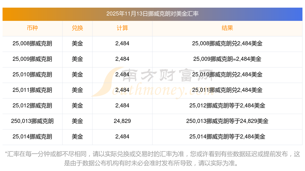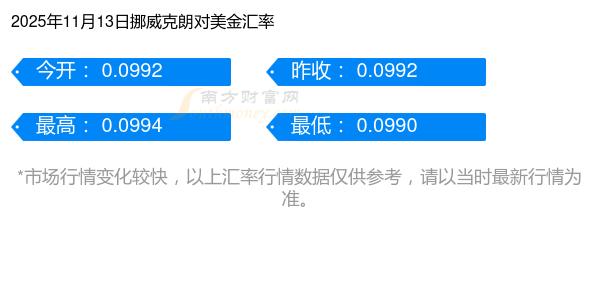 今日挪威克朗匯價表:2025年11月13日8挪威克朗兌美金匯價多少